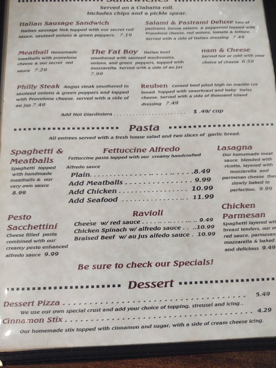 The menu includes classic pub favorites like garlic bread and chicken wings, alongside specialty pizzas such as Meat Lover's, Buffalo Chicken, or a Cauliflower Crust option topped with chicken, mushrooms, and green peppers. For those seeking something a bit different, calzones and Italian-inspired ravioli provide comforting alternatives. Desserts like dessert pizza and cinnamon stix offer a sweet finish to your meal.
